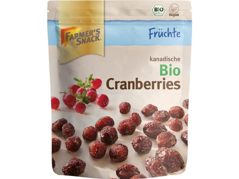 Organska Suva Brusnica Ušećerena Farmer’s Snack – okusite jedinstveni kvalitet iz Kanade. Cele bobice, posebno sočne i slatko-kiselkaste. Možete li da osetite svežinu Kanade? Voćna aroma i intenzivna boja brusnica se izuzetno dobro razvijaju u posebnim klimatskim uslovima Kanade za brusnice. • Organski kvalitet • cele bobice.