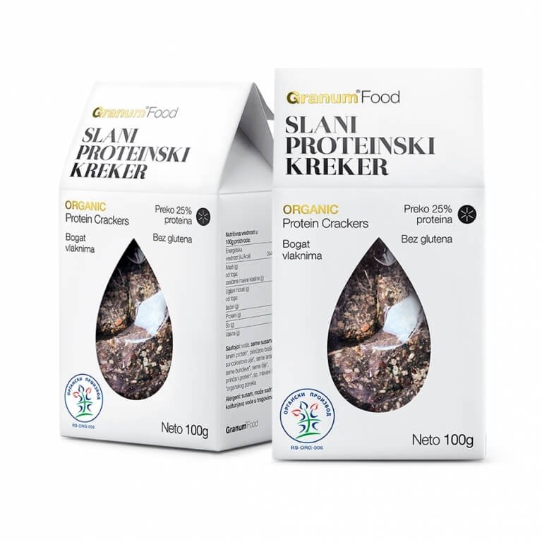 Organski Granum Slani proteinski kreker je  veganska grickalica koja je izvor proteina, te predstavlja idealnu užinu za one koji su u pokretu, a misle na svoje zdravlje. U njegov sastav ulaze pažljivo odabrani, visoko nutritivni sastojci, isključivo sertifikovanog organskog poreklaKrasi ga: